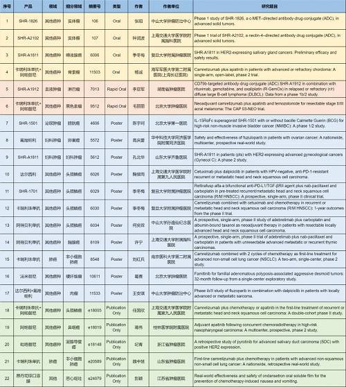 在肺癌、妇科肿瘤、淋巴瘤、膀胱癌、头颈肿瘤、黑色素瘤、肉瘤、鼻咽癌、脊索瘤、唾液腺癌、胸腺癌、硬纤维瘤、涎腺导管癌等其他多个疾病领域,卡瑞利珠单抗、阿帕替尼、阿得贝利单抗、吡咯替尼、达尔西利、氟唑帕利、法米替尼、SHR-1501、瑞拉芙普-α(SHR-1701)、SHR-1826、瑞康曲妥珠单抗(SHR-A1811)、SHR-A1912、SHR-A2102等抗肿瘤创新药相关研究一共入选了4项口头报告、2项快速口头报告、11项壁报展示和4项线上发表,彰显了利来医药强劲的研发实力。此外,昂丹司琼口溶膜在防治化疗导致的恶心呕吐方面展现出了良好的疗效,本次ASCO年会有1项研究线上发表。